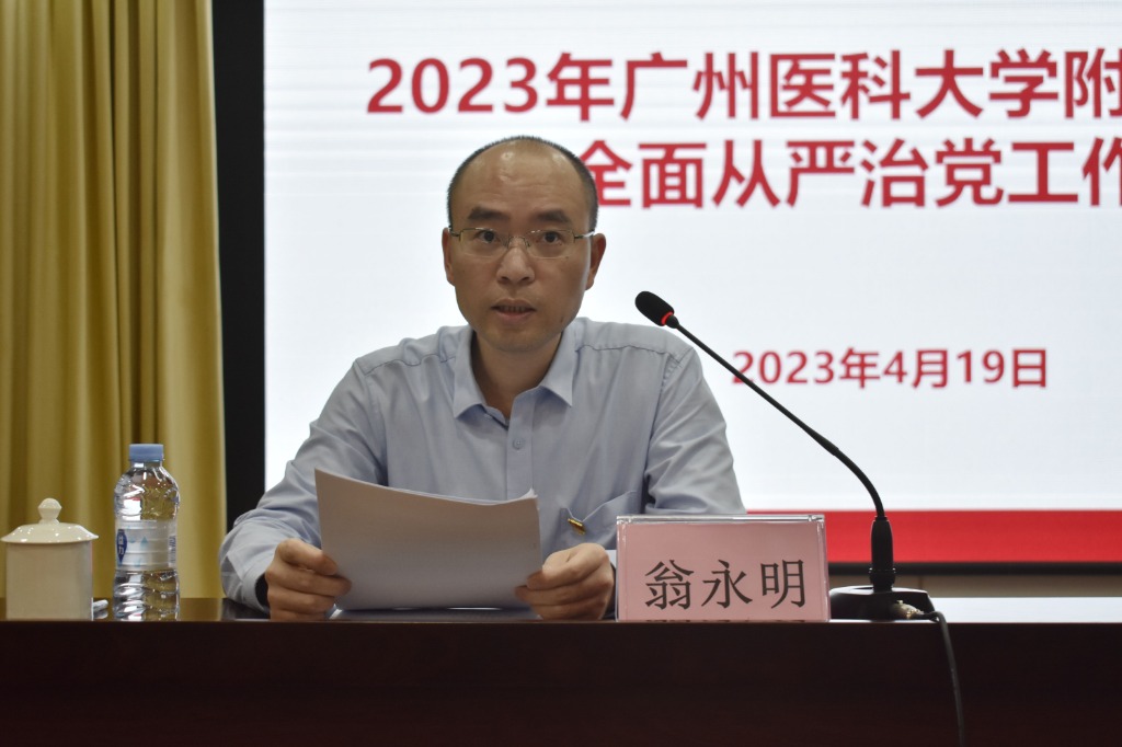 他强调,2023年是全面贯彻党的二十大精神的开局之年,也是医院高质量推进“十四五”事业发展规划和三甲医院创建的攻坚之年,做好全面从严治党工作具有重大和特殊意义。今年我院全面从严治党工作的总体思路是:坚持以习近平新时代中国特色社会主义思想为指导,全面贯彻落实党的二十大精神,认真学习贯彻习近平总书记关于卫生健康的重要论述、对广东广州系列重要讲话和指示批示精神,坚持和加强党对医院工作的全面领导,加强党的创新理论武装,持续提升基层党建质量,以彻底的自我革命精神,一刻不停推进全面从严治党,为医院高质量推进三甲医院创建提供坚强保证。一是从严把握政治标准,坚持和加强党的全面领导;二是从严加强思想建设,坚持不懈用习近平新时代特色社会主义思想凝心铸魂;三是从严加强组织建设,增强党组织政治功能和组织功能;四是从严抓好队伍建设,建设高素质专业化干部人才队伍;五是从严执行党的纪律,坚持以严的基调深入推进党风廉政建设和反腐败工作;六是建设平安医院,不断巩固医院安全稳定和团结奋斗的良好局面。