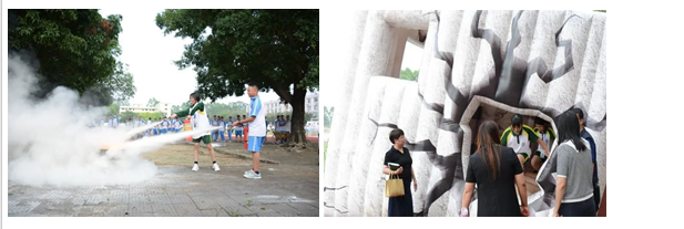 学生和老师积极参与分区体验学习,分别到5个体验区进行地震斜楼、创伤医疗救护 、心肺复苏、烟道帐篷、火灾扑灭体验,在模拟的现实环境中,体验遇险、避险、逃生、救护、抢险所带来的最真实的感受。