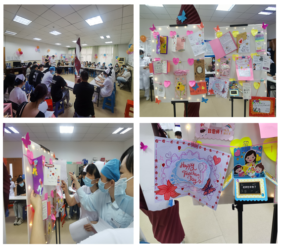 会议开始,护理实习生们为老师们展示了精心准备的特色手工爱心贺卡,同学们的作品丰富多彩,独具特色,运用拼贴、装饰、彩铅、马克笔等多种形式,将自己对老师们的感情寄托于小小的手工艺品之中,为大家呈现出美轮美奂的视觉盛宴。