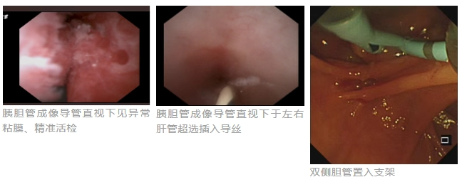 本例患者梗阻部位位于肝门部胆管,术前影像检查考虑非结石性梗阻并肝内胆管扩张,按常规ERCP操作无法进行病变性质观察判断,也无法准确进行双侧胆管置入支架。姚金科主任医师应用eyeMAX“洞察”胰胆管成像系统,顺利进入胆总管、肝总管,胆管内形态清晰可见,并见肝门部胆管黏膜异常生长,直视下精准活检。再检查见左右肝管狭窄,直视下于左右肝管超选插入导丝,再在双侧胆管顺利置入支架。患者手术顺利,术后恢复良好,黄疸消退、胃纳改善。病理最终确定了性质,为下一步治疗指明了方向。