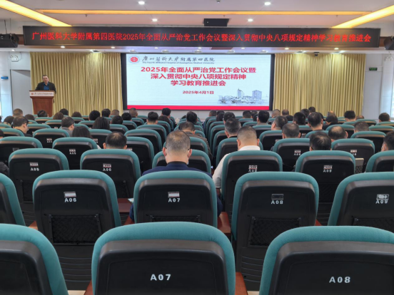 4月1日,广州医科大学附属第四医院2025年全面从严治党工作会议暨深入贯彻中央八项规定精神学习教育推进会在医院3号楼21楼多功能会议室举行。医院党委副书记、院长邢洲传达上级相关会议和文件精神,对我院开展深入贯彻中央八项规定精神学习教育作部署。医院纪委书记翁永明总结部署医院纪检工作,党委书记王治伟作总结讲话。全体医院领导,各党支部书记、全体中层干部、护士长共130余人参加会议。会议召开前,医院已启动深入贯彻中央八项规定精神学习教育。
