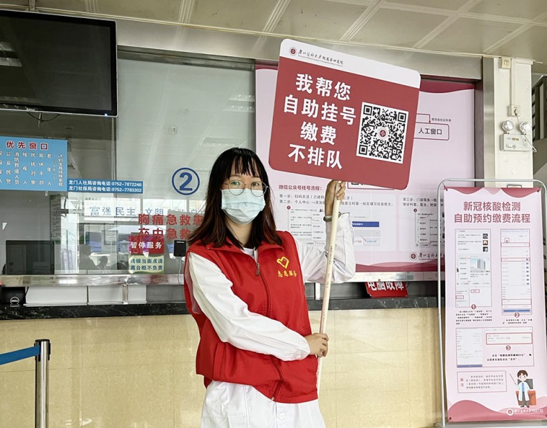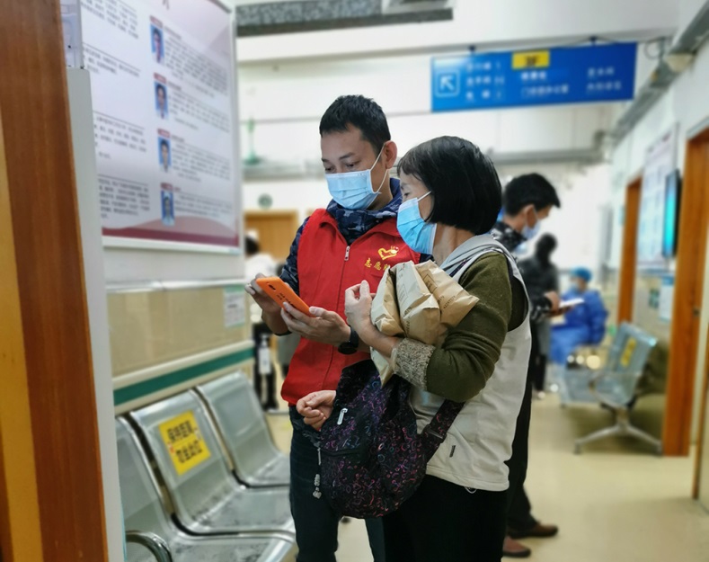 志愿者们有的在窗口向排长队的患者介绍我院的微信公众号自助挂号、缴费功能,有的在自助服务机旁指导患者进行挂号、缴费、打印检查报告等操作,他们耐心为患者解释操作流程,让患者掌握自助服务终端的操作方法。