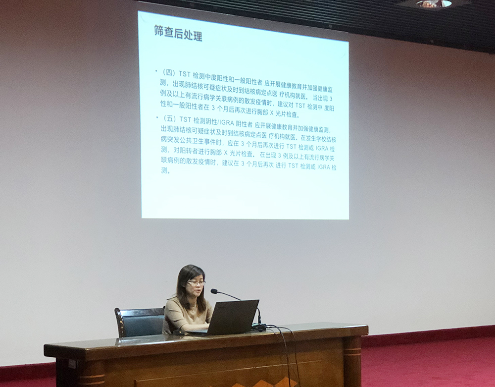 感染科姚叶萍副主任医师则以案例推演的方式向师生们讲述了疑似结核菌感染者的具体筛查方式和诊疗流程,对每种筛查项目的临床意义进行了解读,分析了结核病确诊与潜伏结核菌感染二者之间的区别,并对师生们最关心的问题“当患有结核病后的休复学标准”做了详细的解答。