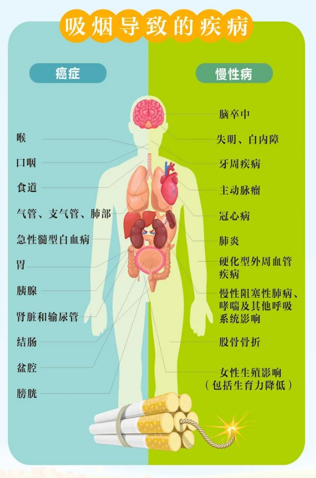 世界前八位致死疾病中有六种疾病分别是:(缺血性心脏病、脑血管病、下呼吸道感染、慢性阻塞性肺疾病、结核和肺癌)与吸烟有关。吸烟可能引发肺、喉、肾、胃、膀胱、结肠、口腔和食道等部位的肿瘤,以及慢性阻塞性肺疾病(COPD)、缺血性心脏病、脑卒中、流产、早产、出生缺陷、阳痿等其他疾病 。
