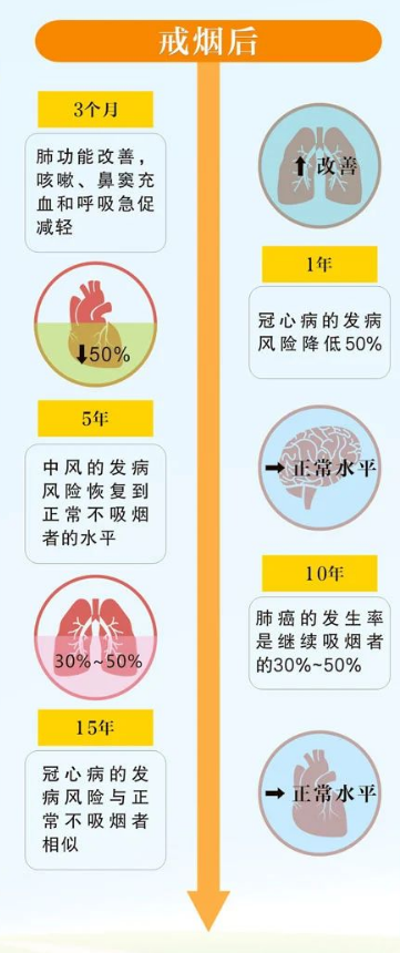 戒烟20分钟:心跳、血压恢复正常;戒烟12小时:血液中一氧化碳含量降至正常水平;戒烟2周:肺功能提升,呼吸更顺畅。
