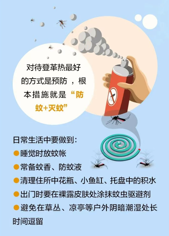 登革热目前尚无特效治疗药物或疫苗,预防登革热的最好办法就是避免被蚊子“叮”上。