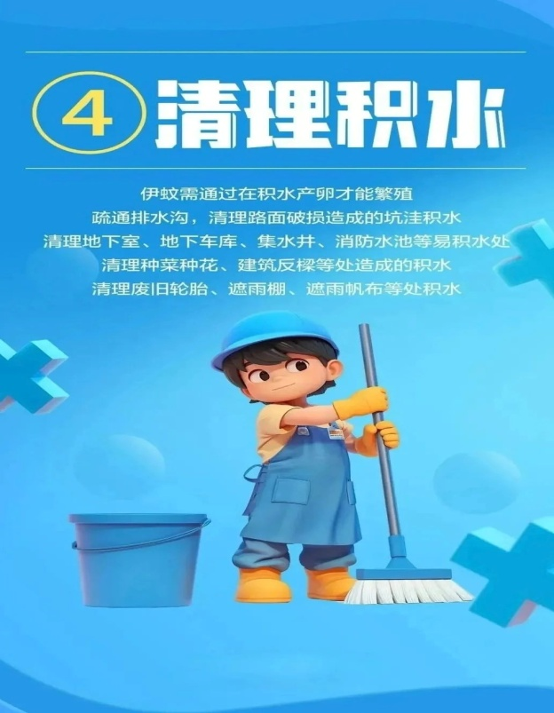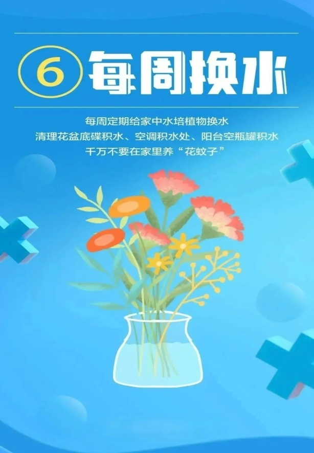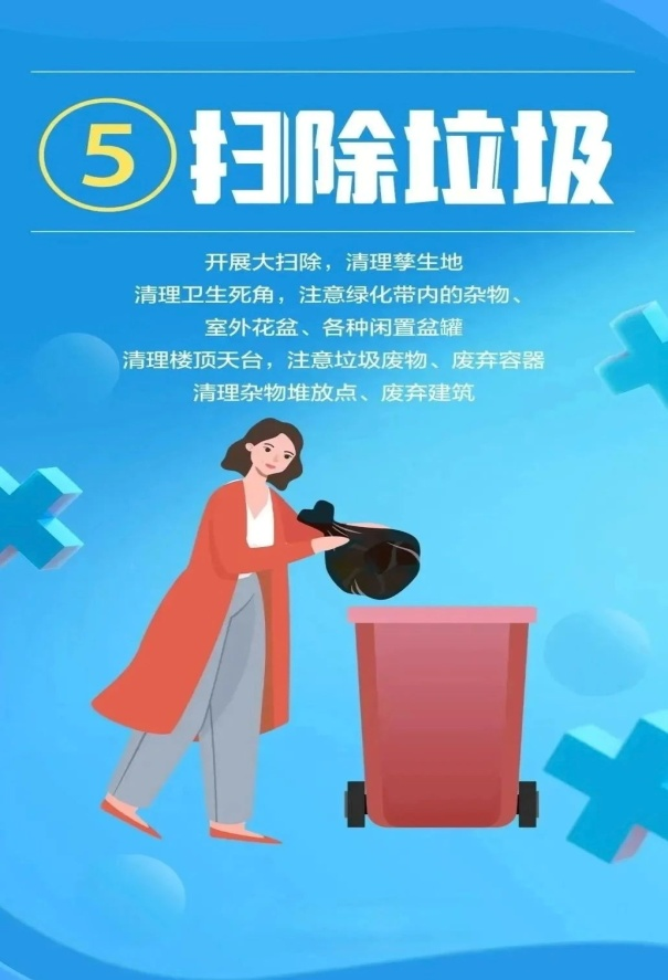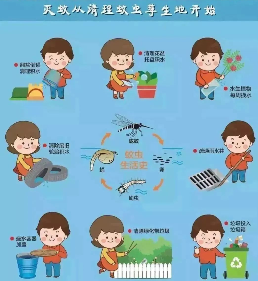讲卫生:常打扫,保持家中干净卫生,避免潮湿环境;闲置废弃容器需清除或翻倒。