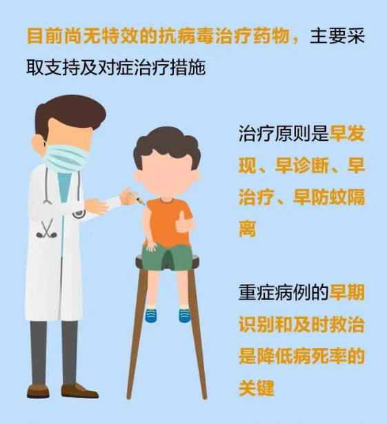治疗原则是早发现、早诊断、早治疗。重症病例的早期识别和及时救治是降低病死率的关键。以对症支持治疗为主,目前尚无有效抗病毒治疗药物。病例应采取防蚊隔离治疗,病程超过5天,且体温自然下降至正常超过 24 小时及以上可解除隔离。