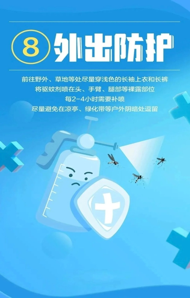 外出:尽量穿浅色长袖衣裤,裸露皮肤涂抹含避蚊胺(DEET)、避蚊酯成分的驱蚊剂。