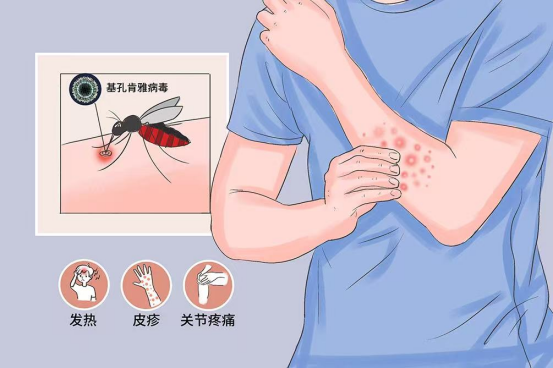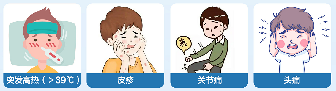 典型症状:突发高热(>39℃)、皮疹、关节痛、头痛。