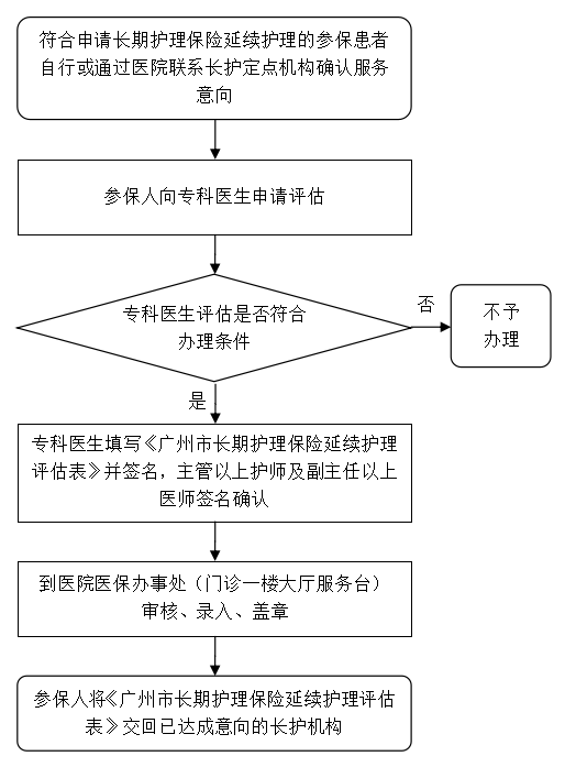 1. 《广州市长期护理保险延续护理评估表》一式三份,一份交申办医疗机构,一份交已达成意向的长护机构,一份由参保人保留。