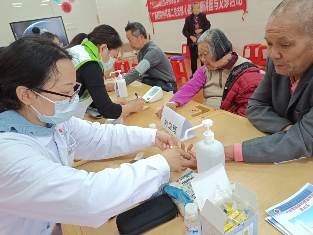 我国心血管病死亡占慢性病死亡原因首位,心梗与心力衰竭(心衰)作为最重要也是最严重的心血管病之一,已成为危害我国人群健康的重要公共卫生问题。为进一步增强人民群众的健康保护意识,贯彻二十大精神,落实“推进健康中国建设”,将优质医疗资源送到农村和社区,并以增强社区居民对心梗、心衰的防范意识,珍爱身心健康,推动医疗卫生服务与党建工作的深度融合,3月28日上午,广医四院内科第二党支部医护团队开展“关爱心脏,健康同行”主题党日活动,走进荔湖街雁塔社区综合养老服务中心,开展心衰专题义诊活动。我院胸痛中心专家苏海芳副主任医师、心衰中心专家梁思宇主治医师、健康管理专家龙玲主治医师等专家团队现场坐诊为居民提供健康咨询,解答居民健康方面的疑问,特别是针对心梗与心衰的早预防、早发现、早治疗与康复知识等医疗知识内容。