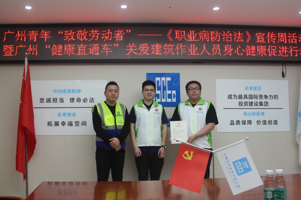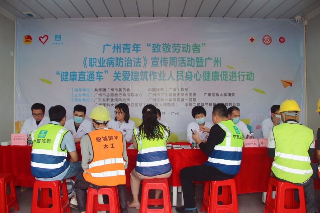 近日,我院团委组织青年志愿者参与由团市委、市志愿者行动中心、市卫生健康局团委、学校团委在增城区新塘镇金茂万科都会四季项目工地联合主办的“广州青年‘致敬劳动者’——《职业病防治法》宣传周活动暨广州‘健康直通车’关爱建筑作业人员身心健康促进行动活动”。
