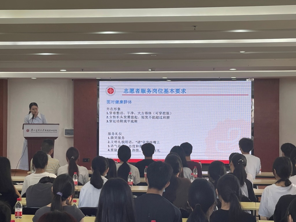 为弘扬“奉献、友爱、互助、进步”的志愿者精神,引导社会各界关心和参与志愿服务工作,配合医院提档升级工程,进一步改善群众就医感受,帮助群众及时便捷体检就医,同时为在校医学生提供志愿服务平台,我院团委联合门诊管理办公室、健康管理中心于11月5日和11月19日上午在医院开展“志愿于心,真诚于行”广州医科大学附属第四医院志愿者培训,共有100余名志愿者参与。