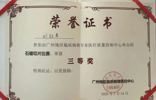 我院病理科负责人吴共发表示,优质病理切片是病理诊断的基石,承载着对生命的敬重与对专业的坚守。石蜡切片作为最常用的病理制片技术,其质量直接关系病理诊断的准确性,每一个细微操作都会影响最终的组织呈现效果。刘钰君主管技师以精湛技艺和不懈努力,生动诠释了工匠精神,他的获奖也将激励整个病理技术团队精益求精,追求更高专业水准。