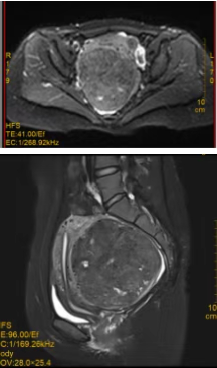入院后,盆腔核磁共振检查显示,其子宫内多个占位病变,最大者体积达10×9.8×10.1cm3,增强扫描可见病灶明显强化,结合临床症状,诊断为子宫肌瘤。