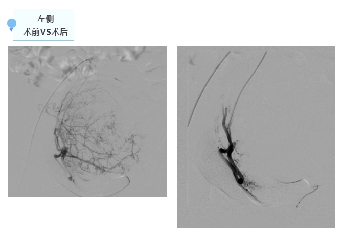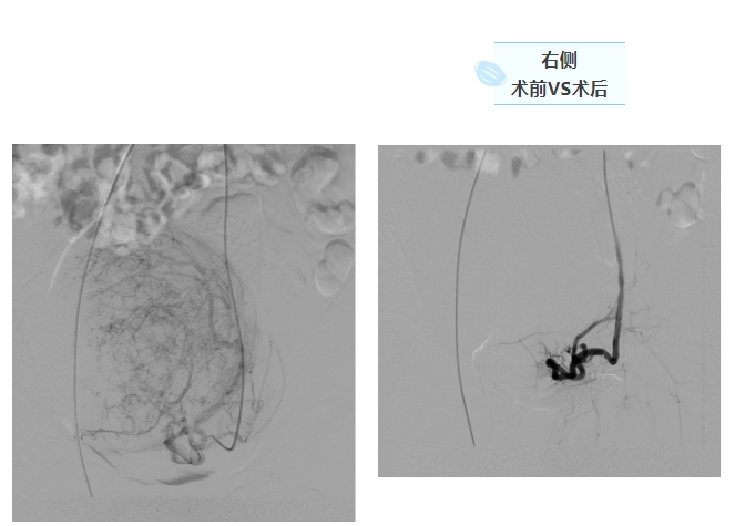手术当天,在郭友主任的带领下,介入团队展现出精湛技艺,通过右侧腹股沟微小针口进行局部麻醉穿刺,在数字减影血管造影(DSA)的精准引导下,将导管准确置入双侧子宫动脉,随后注入空白微球及明胶海绵颗粒进行栓塞。手术全程仅耗时不到2小时,出血量不到5ml,随着双侧子宫肌瘤异常染色消失,宣告子宫肌瘤成功栓塞,肌瘤失去主要血供来源。此外,卵巢具备丰富的供血动脉,即使双侧子宫动脉栓塞,仍能维持正常生理功能,为患者保留生育功能。