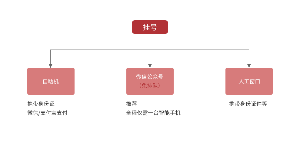 流程:扫码关注→门诊服务→我要挂号→选择就诊科室、医生、时段→手机支付。
