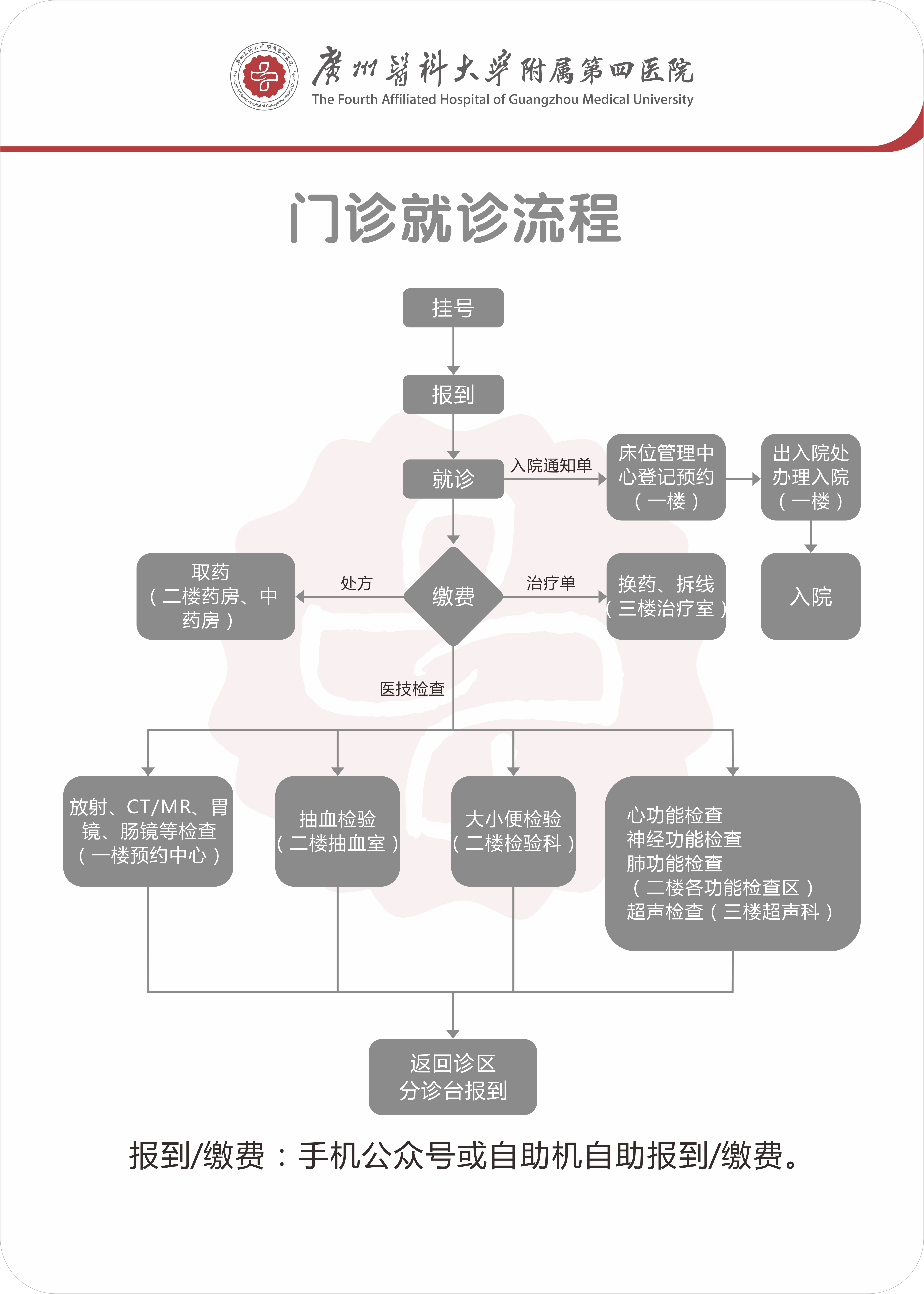 检查:缴费后,大型检查(CT/MR、胃肠镜等)请到检查预约中心(门诊一楼大堂)办理手续。