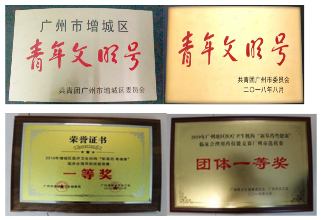 药学部为增城区医学会医院药学专业管理委员会主委单位(筹备中),2015年获广州市增城区青年文明号称号,2018年获得广州市青年文明号称号,连续多年获得医院优秀科室一等奖、年度优秀带教科室、宣传工作优秀科室一等奖。2019年在“新基药粤健康”临床合理用药技能竞赛中获得增城区医疗卫生机构团队一等奖、广州地区医疗机构团体一等奖。药剂科为增城卫校及省内各医药院校药学专业本科、大专实习、见习基地,承担着实习带教工作。