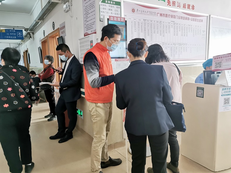 志愿者们有的在窗口向排长队的患者介绍我院的微信公众号自助挂号、缴费功能,有的在自助服务机旁指导患者进行挂号、缴费、打印检查报告等操作,他们耐心为患者解释操作流程,让患者掌握自助服务终端的操作方法。