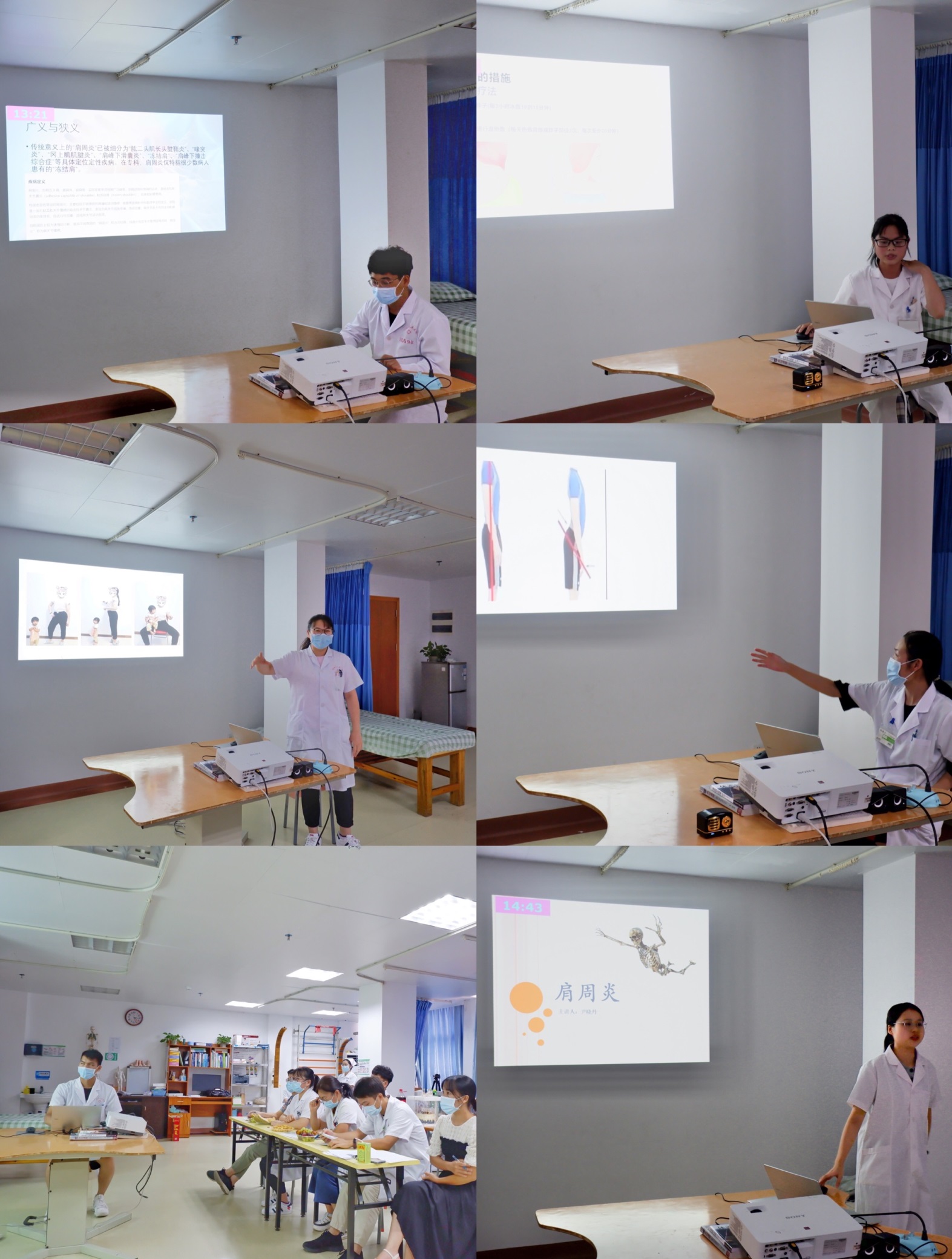 比赛第一环节分为师生两组,以理论授课的形式“展示风采”。教师组罗艳湘、梁水齐、赖培森选取了“骨盆评估”“偏瘫患者的步态分析”“肩周炎相关论文研究”的课题;学生组何穆演、林冰纯、尹晓丹选取了“落枕”“下交叉综合征”“肩周炎”的课题。在15分钟的规定时间内,选手们借助多媒体工具,用生动的语言精彩讲述了自己精心准备的课程,在讲课过程中充分展示了个人魅力及专业知识的积累。